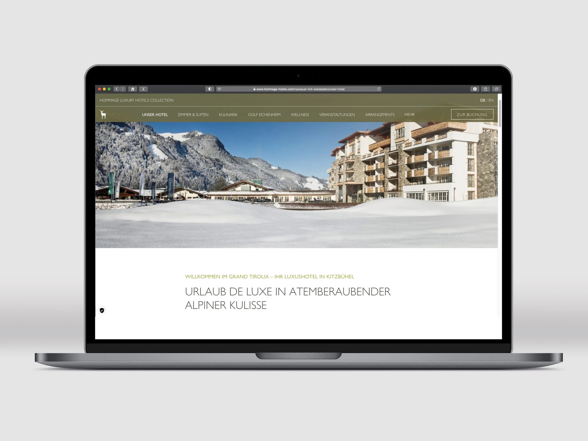 Das Grand Tirolia ist ein exklusives 5-Sterne-Hotel in Kitzbühel, das zur Hommage Luxury Hotels Collection gehört. Jedes Hotel dieser Kollektion erhält eine maßgeschneiderte Corporate Identity, die auf den einzigartigen Charakter des Hauses abgestimmt ist. Das hier gezeigte Beispiel des Grand Tirolia steht stellvertretend für die sechs Hotels der Collection.