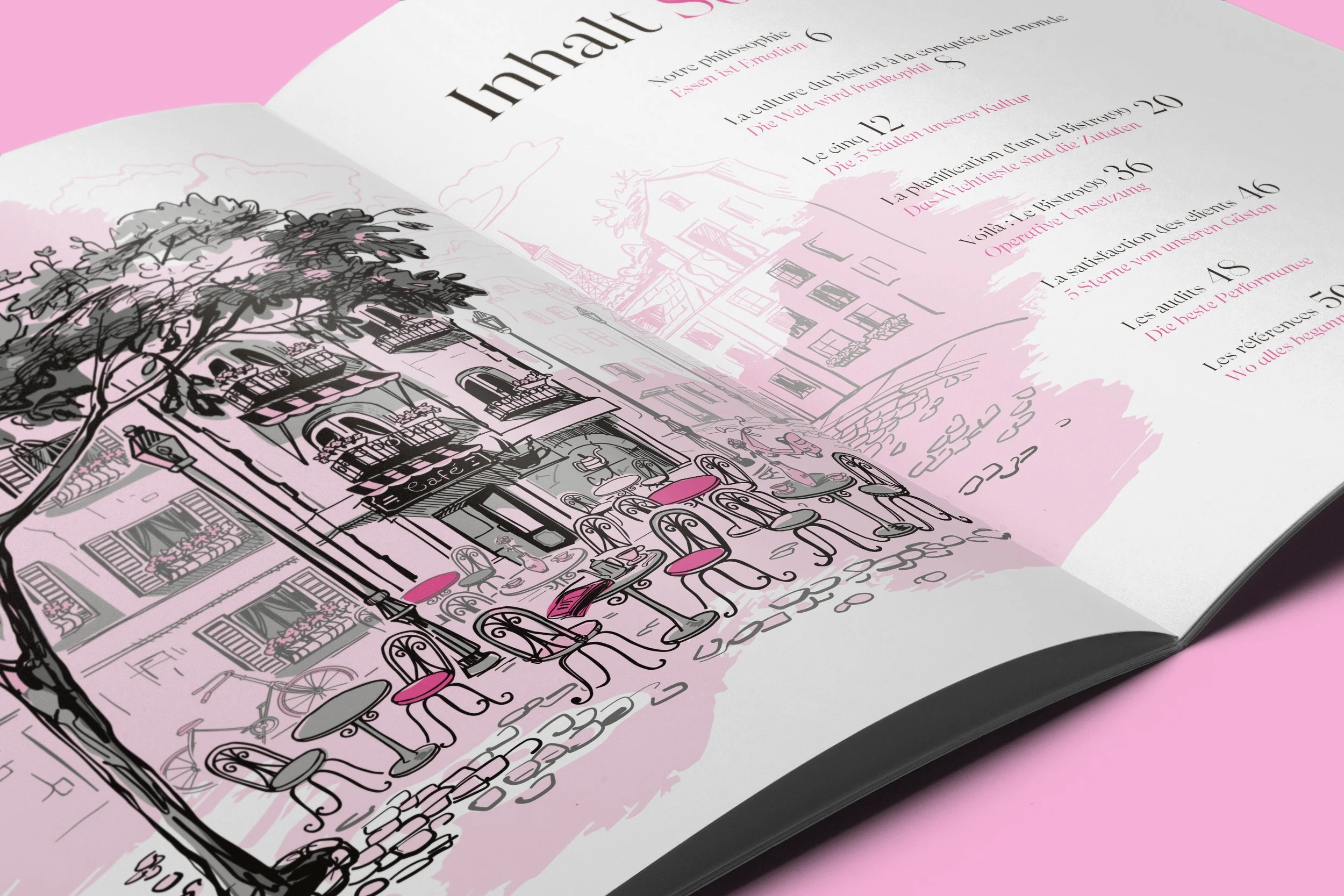 Diese Broschüre für ein französisches Bistro in Deutschland entstand mit viel Hingabe. Zusammen mit einem Illustrator wurden typische französische Szenen lebendig umgesetzt. Eine passende Schrift und charmante Details wie die zweisprachige Headline vermitteln das französische Lebensgefühl und schaffen ein authentisches Erlebnis.